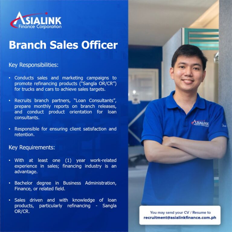 Interested applicants are invited to submit their resumes via email to kimberly.saguirre@asialinkfinance.com.ph / benguet.tm@asialinkfinance.com.ph