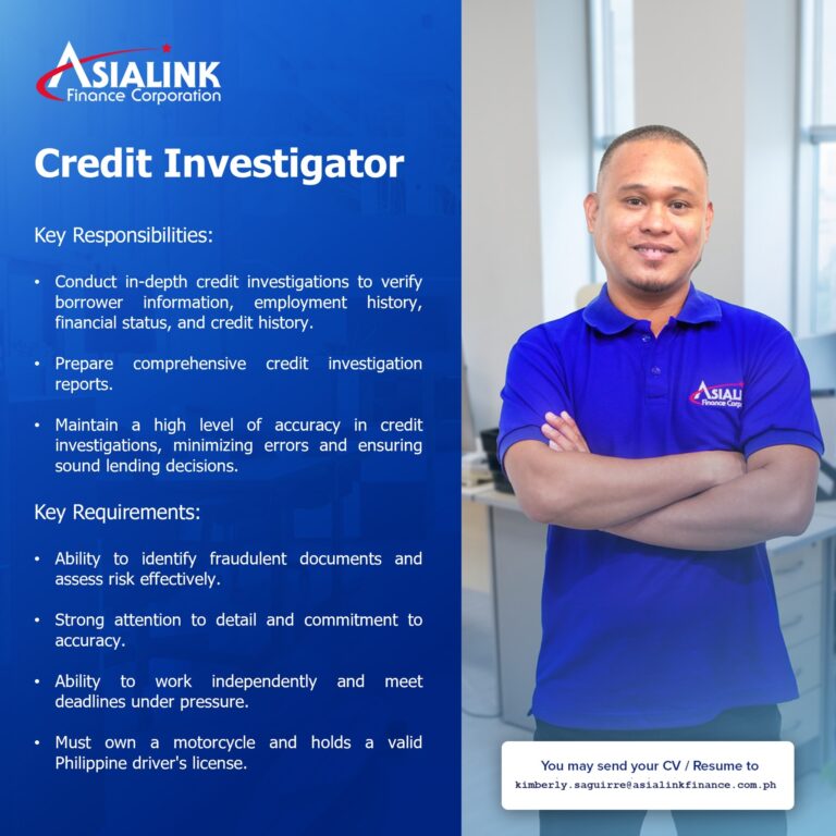 Interested applicants are invited to submit their resumes via email to kimberly.saguirre@asialinkfinance.com.ph / benguet.tm@asialinkfinance.com.ph