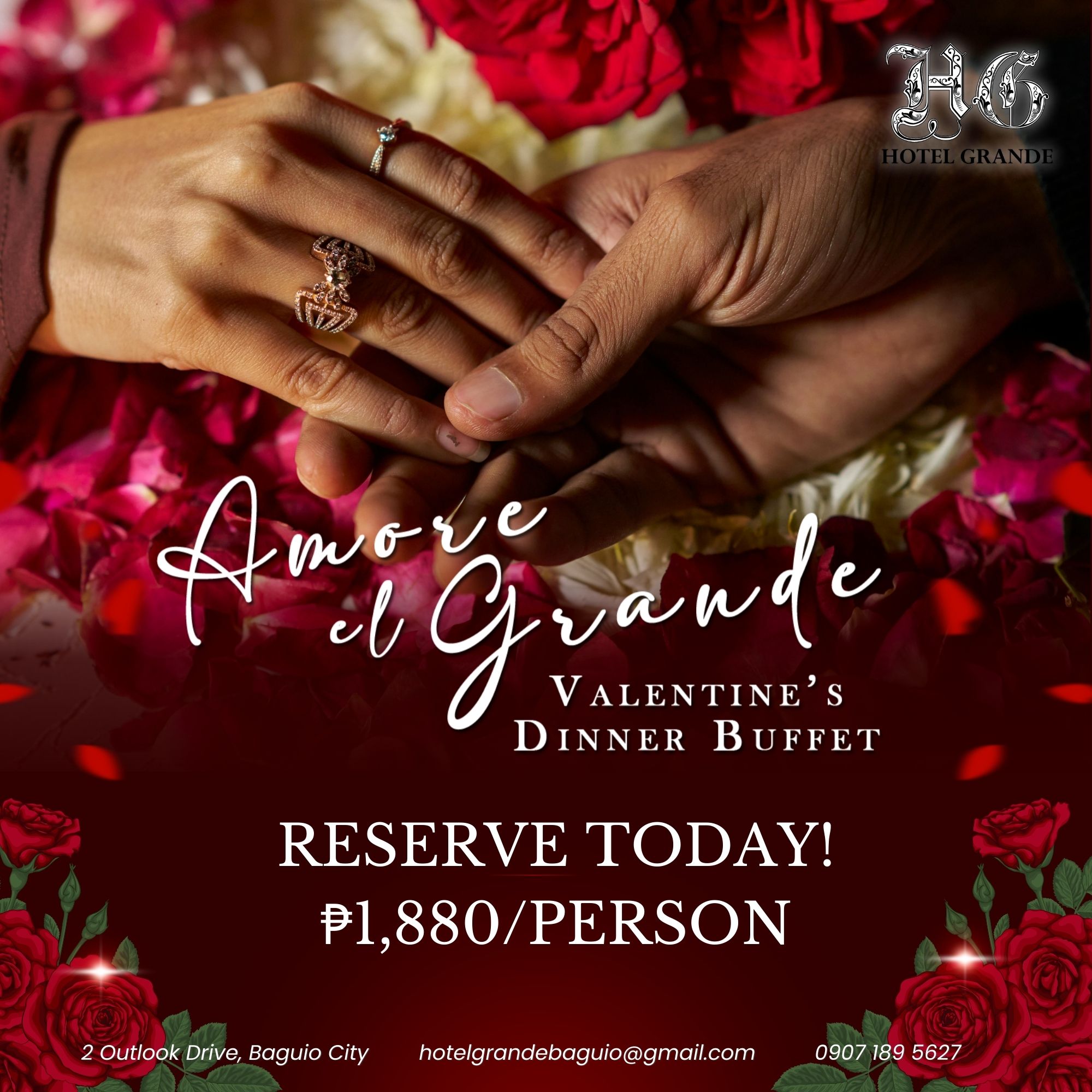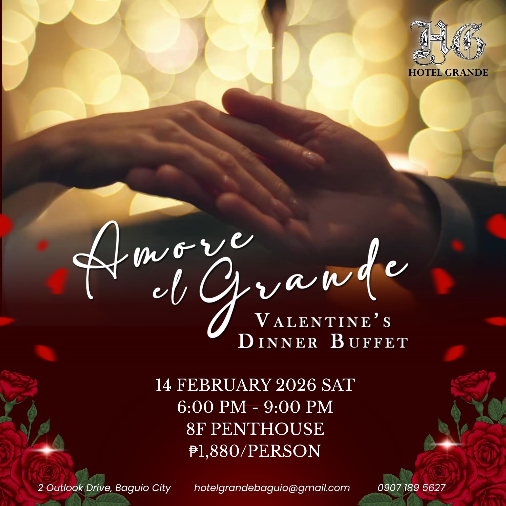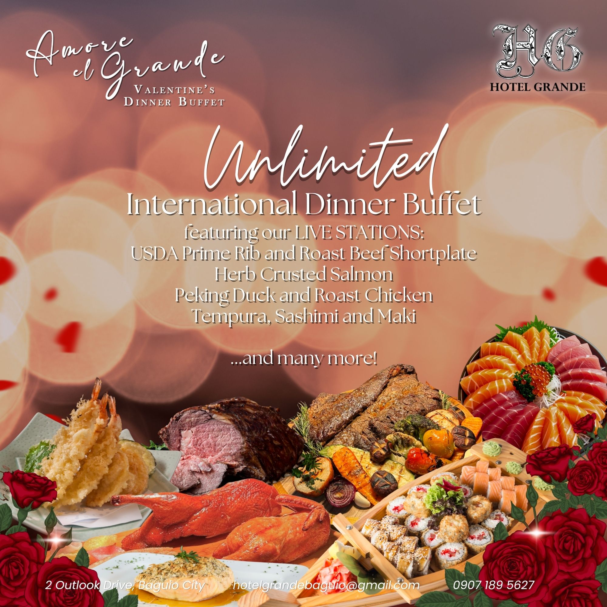 Amore el Grande - Valentine's Dinner Buffet Celebrate love in an intimate and elegant setting this Valentine's Day at Hotel Grande. Indulge in a romantic dinner buffet experience with breathtaking views, perfect for couples and loved ones.