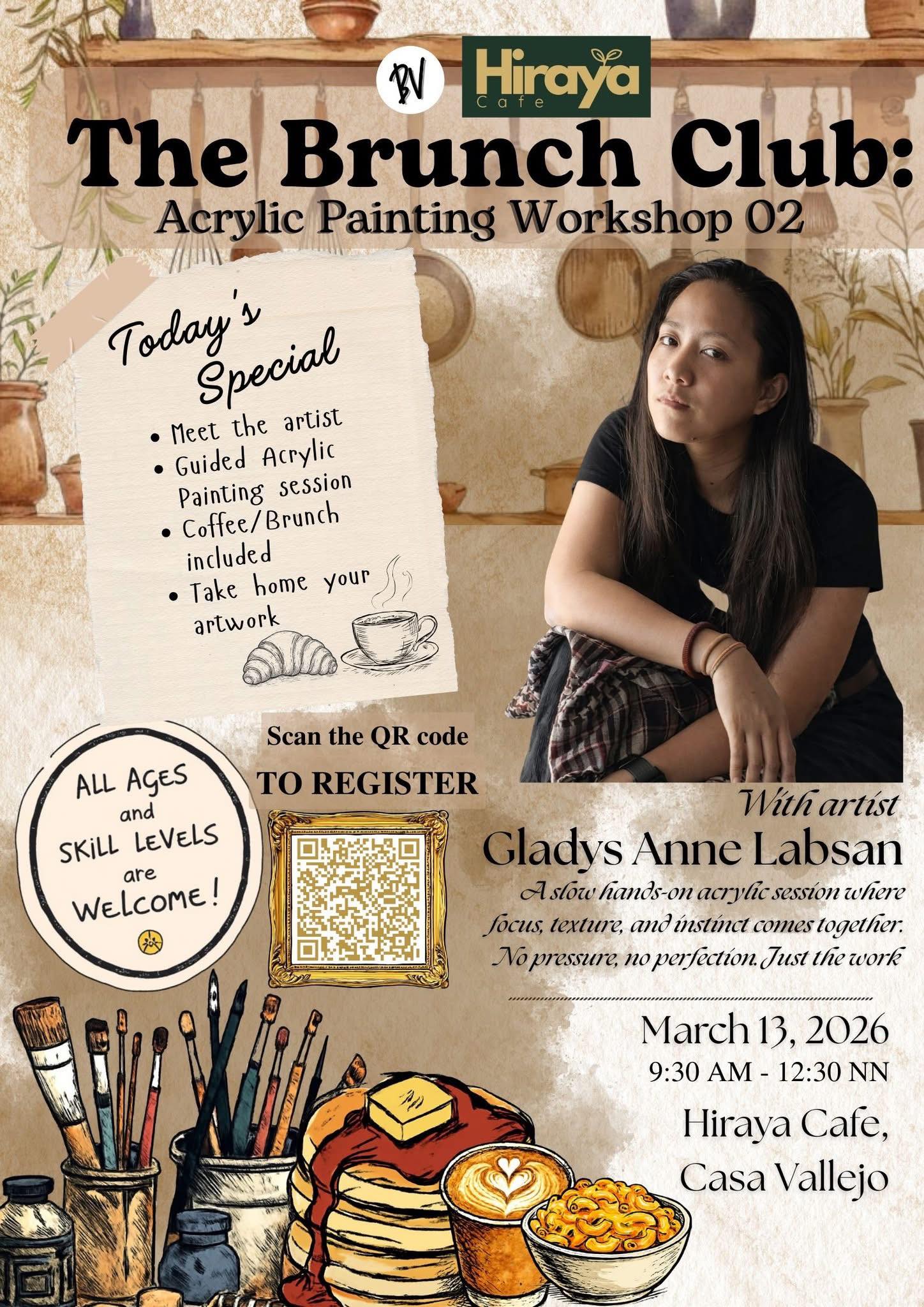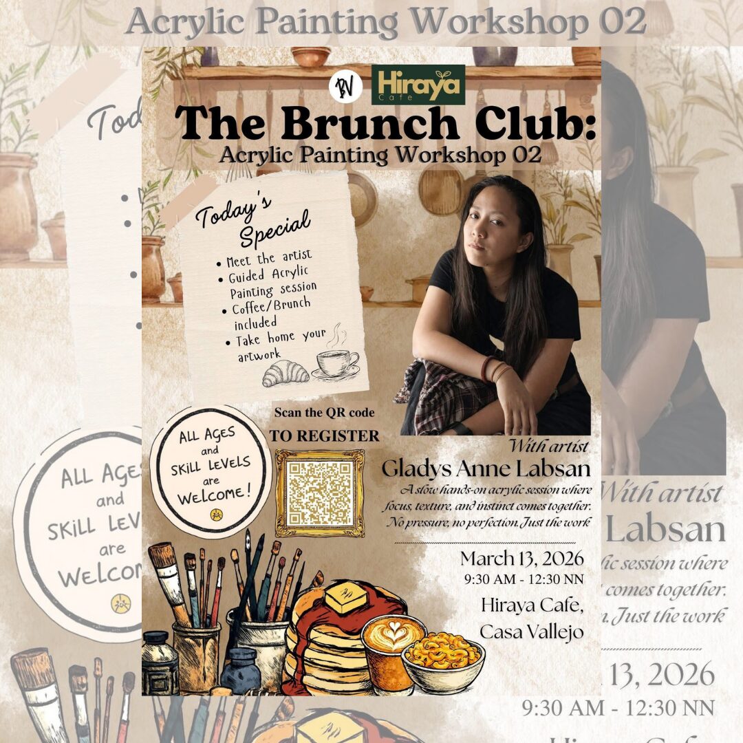 Join us for The Brunch Club: Acrylic Painting Workshop 02, with Gladys Anne Labsan on March 13, 2026, 9:30 AM – 12:30 NN at Hiraya Cafe, Casa Vallejo. Registration fee is 1,500.00 only with 470.00 food and drink consumable