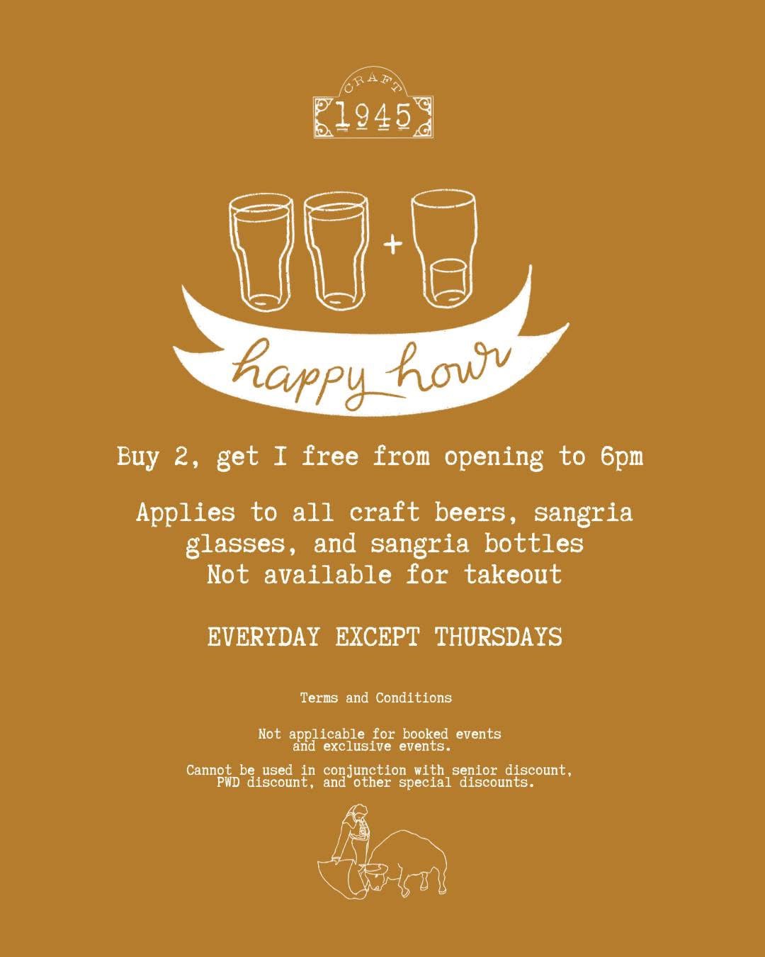 Buy 2, get 1 free from opening to 6pm Applies to all craft beers, sangria glasses, and sangria bottles Not available for takeout