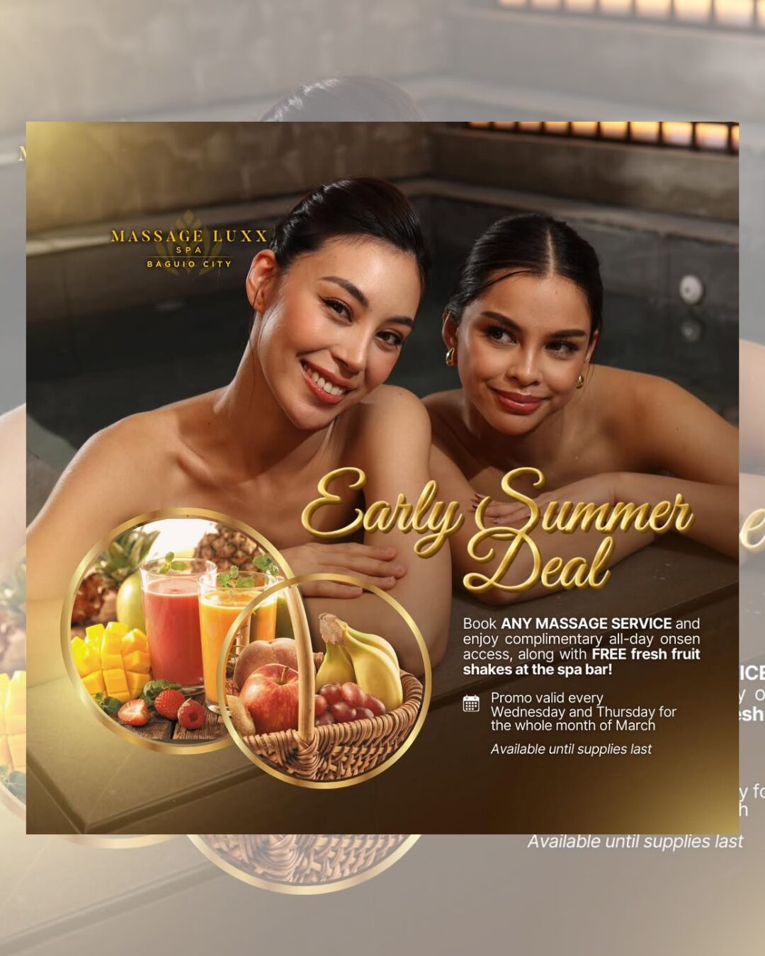 Baguio’s heat has been turning up lately, and there’s no better way to cool down! Book ANY MASSAGE SERVICE and enjoy complimentary all-day onsen access, plus refreshing fresh fruit shakes at the spa bar