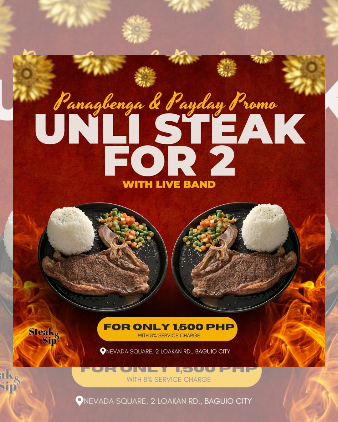 𝗣𝗔𝗡𝗔𝗚𝗕𝗘𝗡𝗚𝗔 & 𝗣𝗔𝗬𝗗𝗔𝗬 𝗣𝗥𝗢𝗠𝗢 𝗬𝗼𝘂’𝘃𝗲 𝘄𝗼𝗿𝗸𝗲𝗱 𝗵𝗮𝗿𝗱, 𝗻𝗼𝘄 𝗶𝘁’𝘀 𝘁𝗶𝗺𝗲 𝘁𝗼 𝗲𝗮𝘁 𝘄𝗲𝗹𝗹! 𝗧𝗿𝗲𝗮𝘁 𝘆𝗼𝘂𝗿𝘀𝗲𝗹𝗳 𝗮𝗻𝗱 𝗮 𝗳𝗿𝗶𝗲𝗻𝗱 𝘁𝗼 𝘁𝗵𝗲 𝘂𝗹𝘁𝗶𝗺𝗮𝘁𝗲 𝗣𝗮𝘆𝗱𝗮𝘆 𝗣𝗿𝗼𝗺𝗼. 𝗨𝗻𝗹𝗶𝗺𝗶𝘁𝗲𝗱 𝘀𝘁𝗲𝗮𝗸, 𝗴𝗿𝗲𝗮𝘁 𝘃𝗶𝗯𝗲𝘀, 𝗮𝗻𝗱 𝗹𝗶𝘃𝗲 𝗺𝘂𝘀𝗶𝗰—𝘄𝗵𝗮𝘁 𝗺𝗼𝗿𝗲 𝗱𝗼 𝘆𝗼𝘂 𝗻𝗲𝗲𝗱? 𝗨𝗡𝗟𝗜 𝗦𝗧𝗘𝗔𝗞 𝗙𝗢𝗥 𝟮 Price: 1,500 PHP ( 𝘱𝘭𝘶𝘴 8% 𝘴𝘦𝘳𝘷𝘪𝘤𝘦 𝘤𝘩𝘢𝘳𝘨𝘦 ) Vibe: Live Band included VALIDITY - WEEKENDS ONLY! Visit us at Nevada Square, 2 Loakan Rd., Baguio City