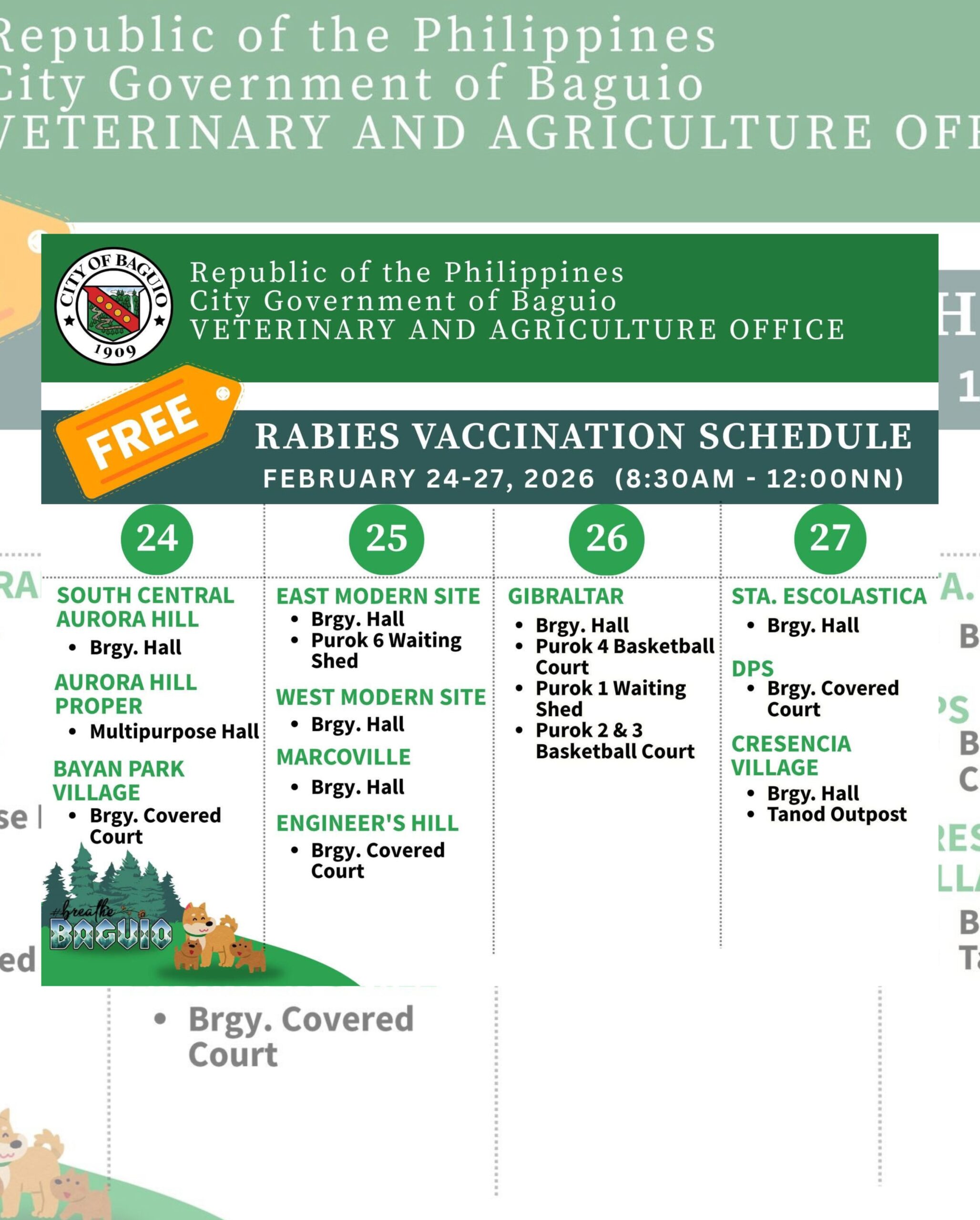 Come to the following barangays and avail of FREE rabies vaccination for your dogs and cats. Let us do our part to ensure a rabies-free community!