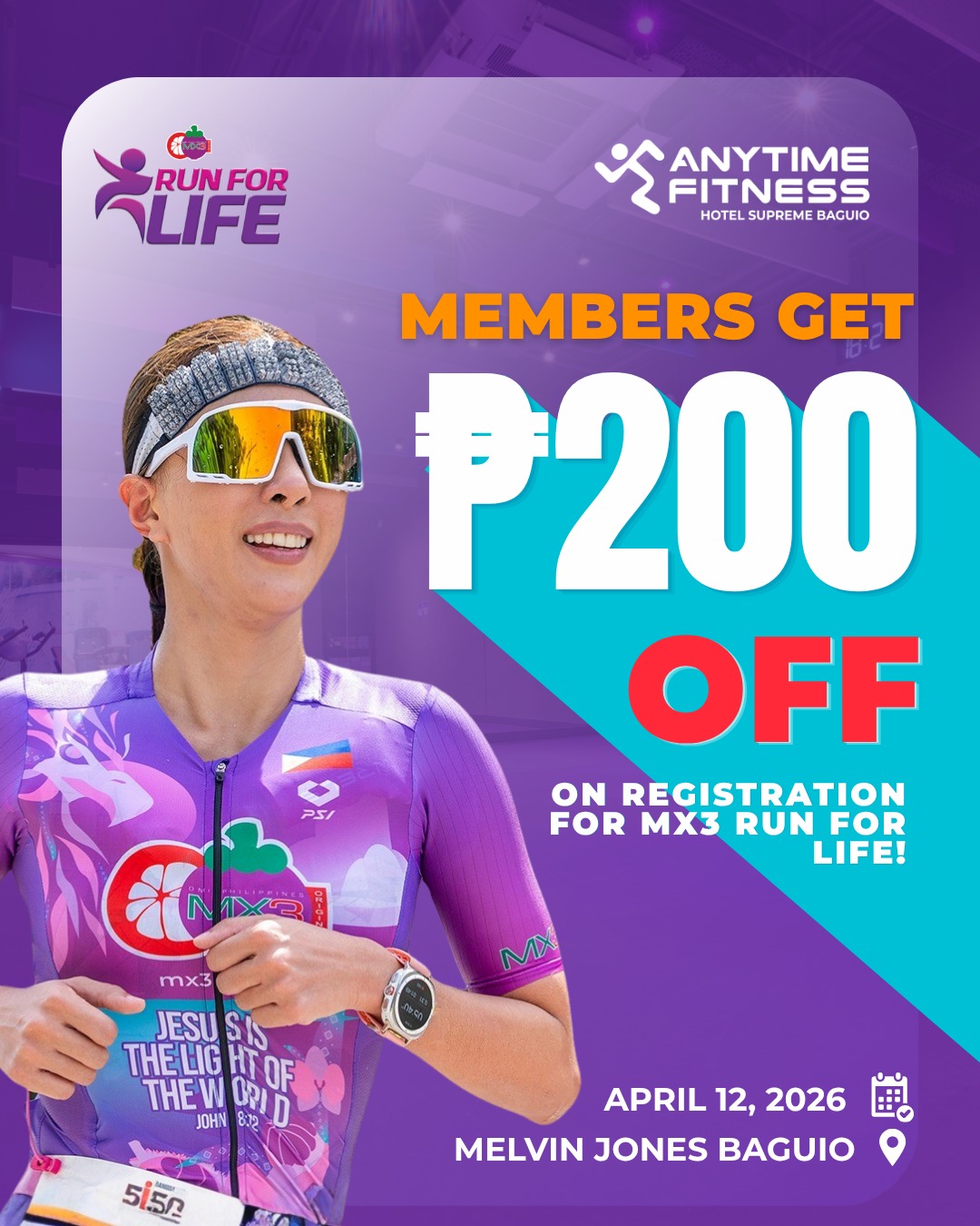 All Anytime Fitness members will get ₱𝟮𝟬𝟬 𝗢𝗙𝗙 on registration for the MX3 Run. This is your chance to run, represent the Purple Warriors community, and enjoy an exclusive member perk.