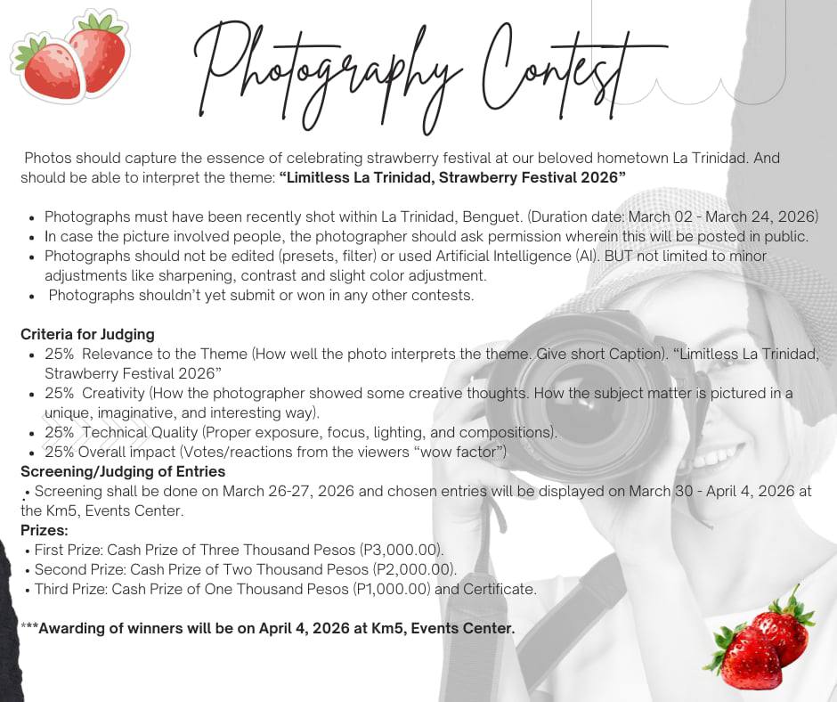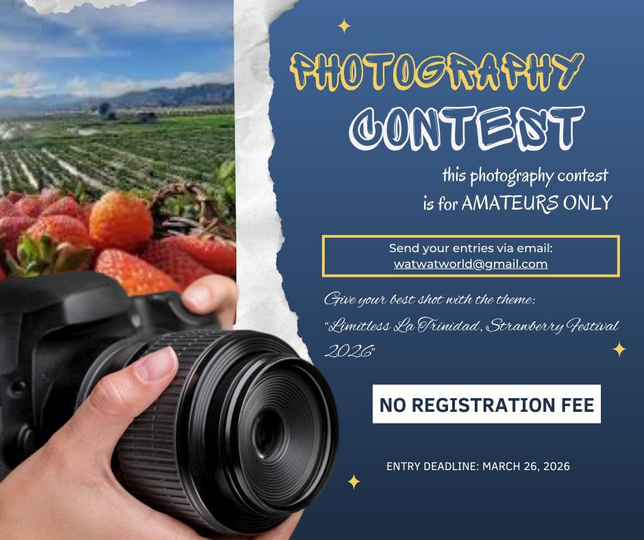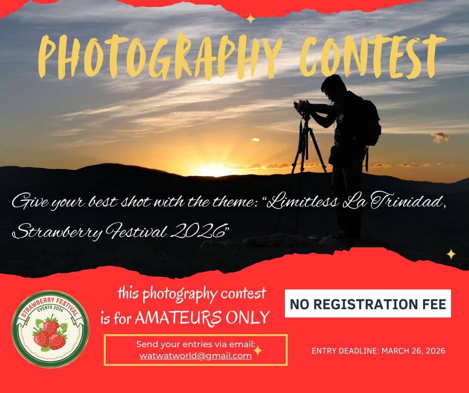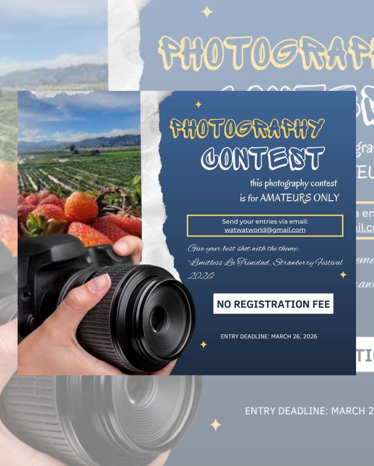 Amateur by our contest definition is 14-20 years old, a resident or student of La Trinidad, has not won any municipal, provincial or national photo contest. Can use phone or DSLR as long as photo is in high resolution for quality printing. ACCEPTING ENTRIL UNTIL: MARCH 26, 2026