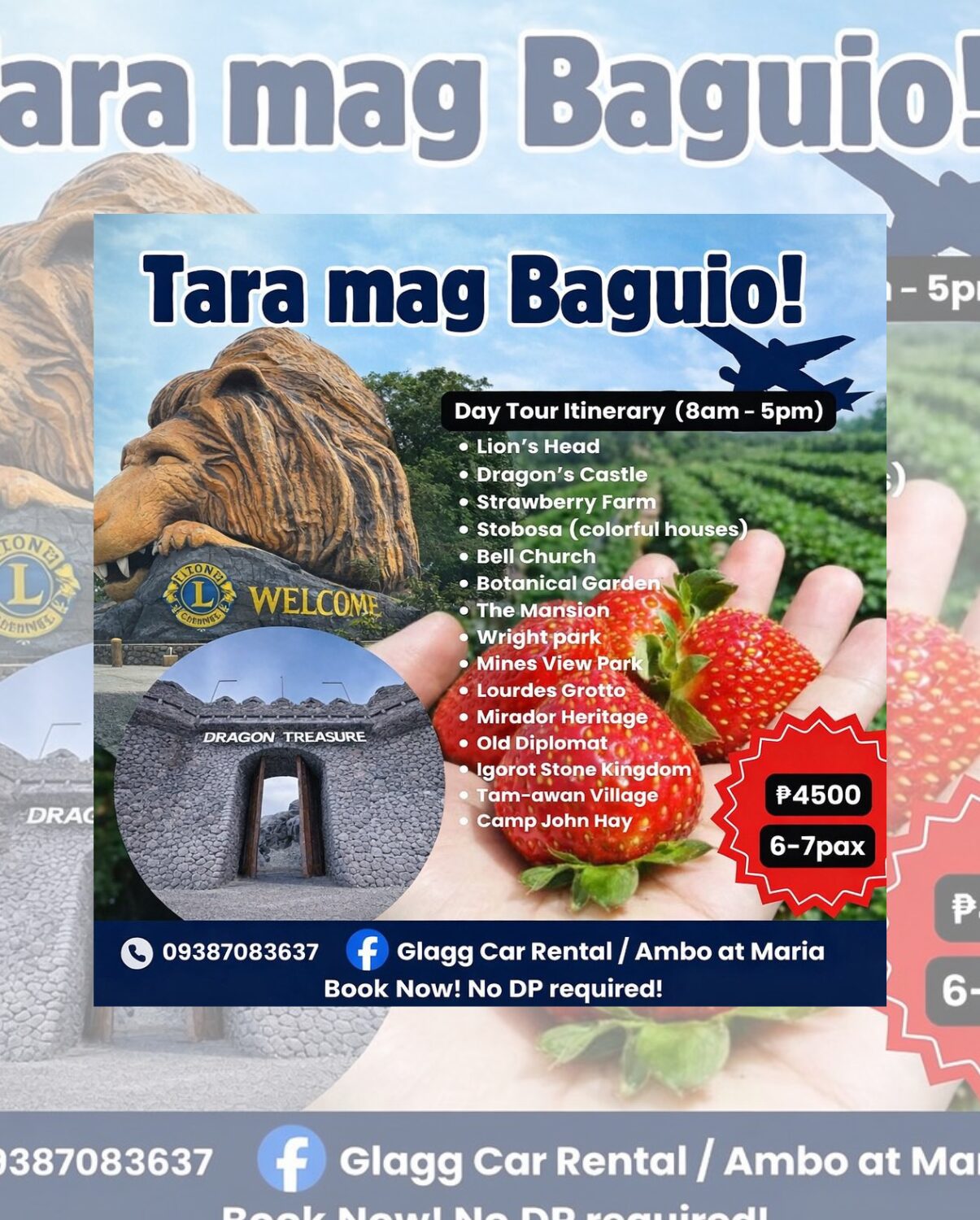 Baguio Tour – ₱4,500 Atok Tour – ₱5,500 Atok + Baguio Side Trip – ₱6,000 Mt. Camisong Tour – ₱4,500