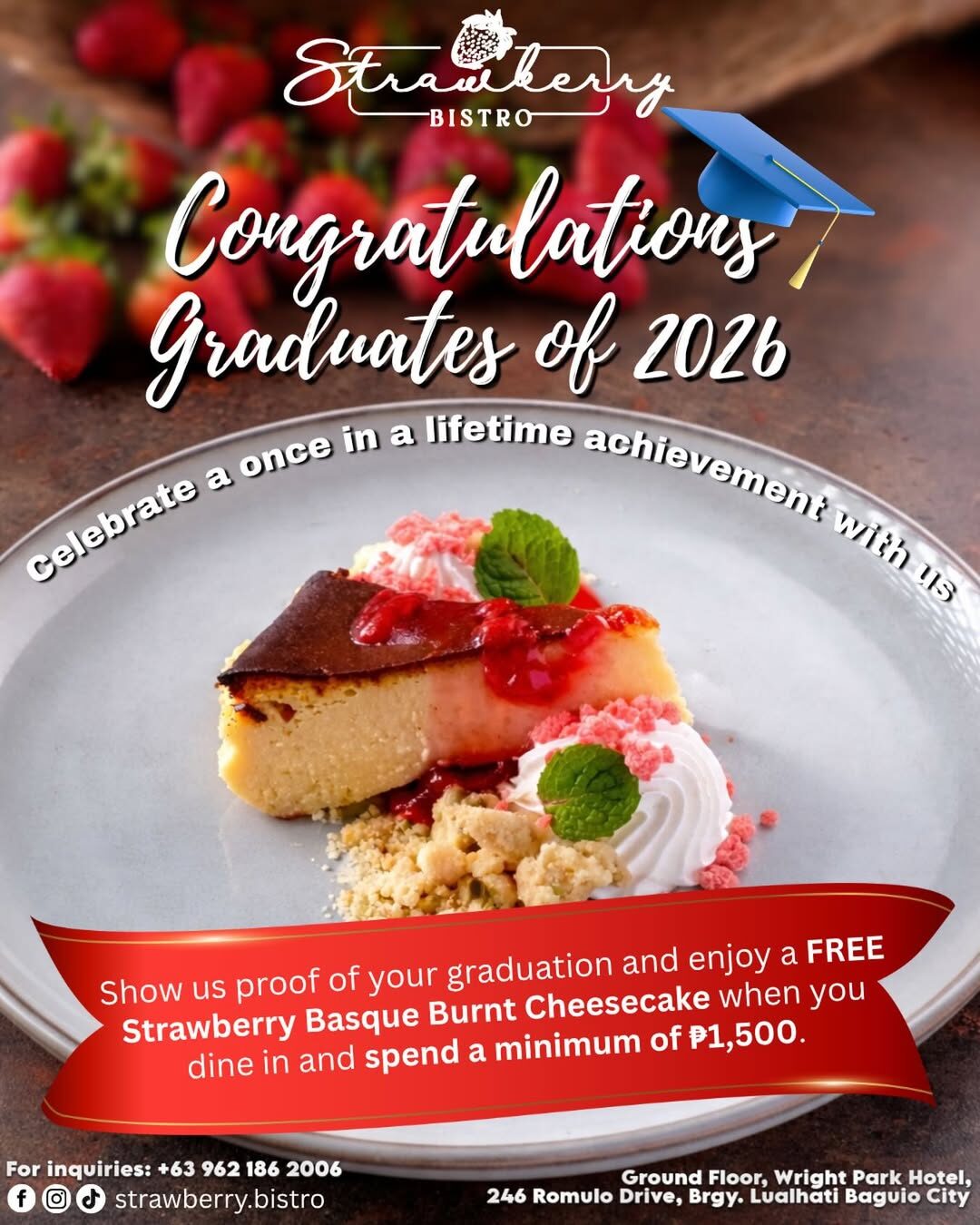 Celebrate your milestone with us—just show your proof of graduation and enjoy a FREE Strawberry Basque Burnt Cheesecake when you dine in and spend at least ₱1,500