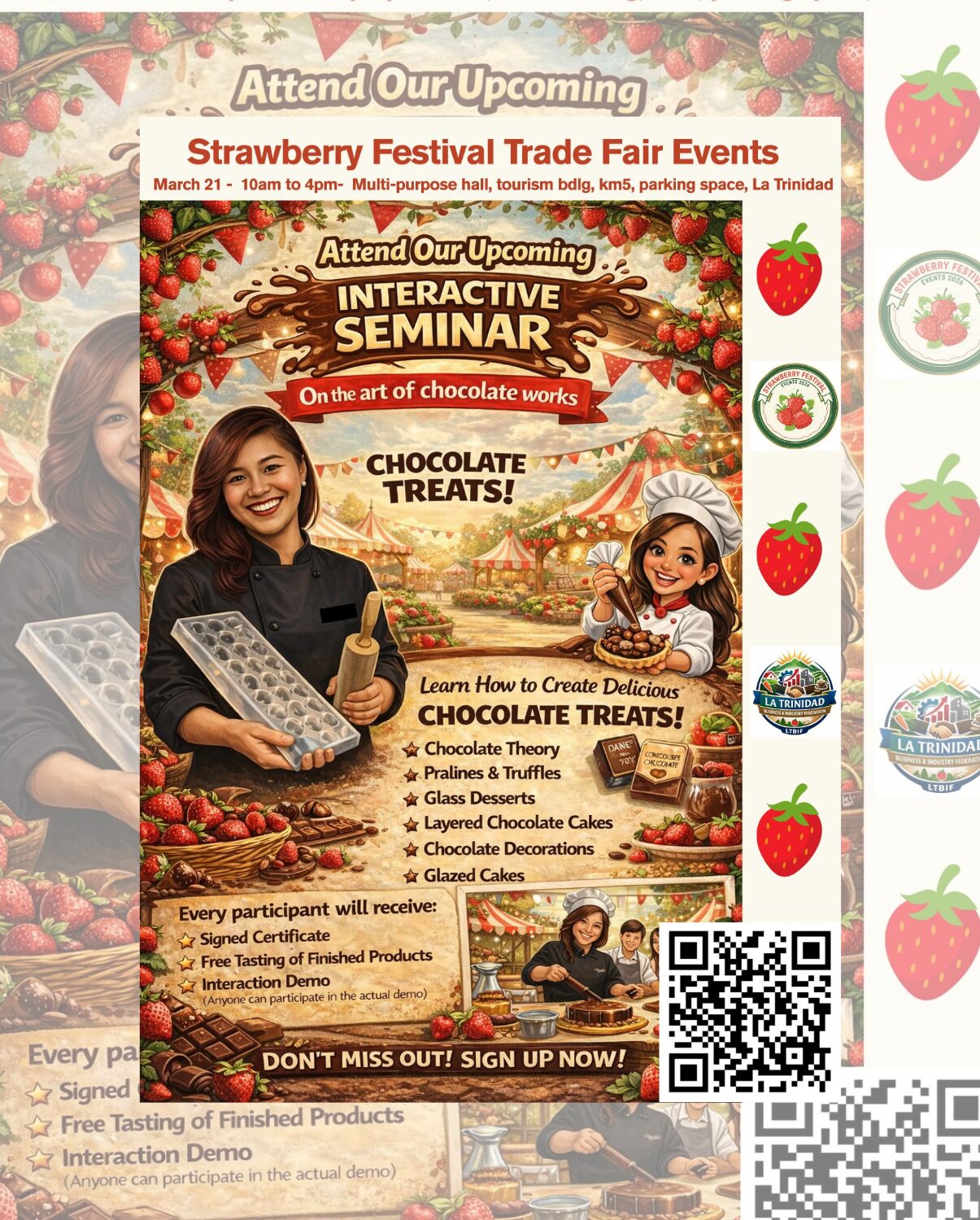 Join us for an interactive seminar where passion meets craftsmanship. Learn the secrets behind creating exquisite chocolate masterpieces—from tempering techniques to artistic designs that delight both the eyes and the taste buds.