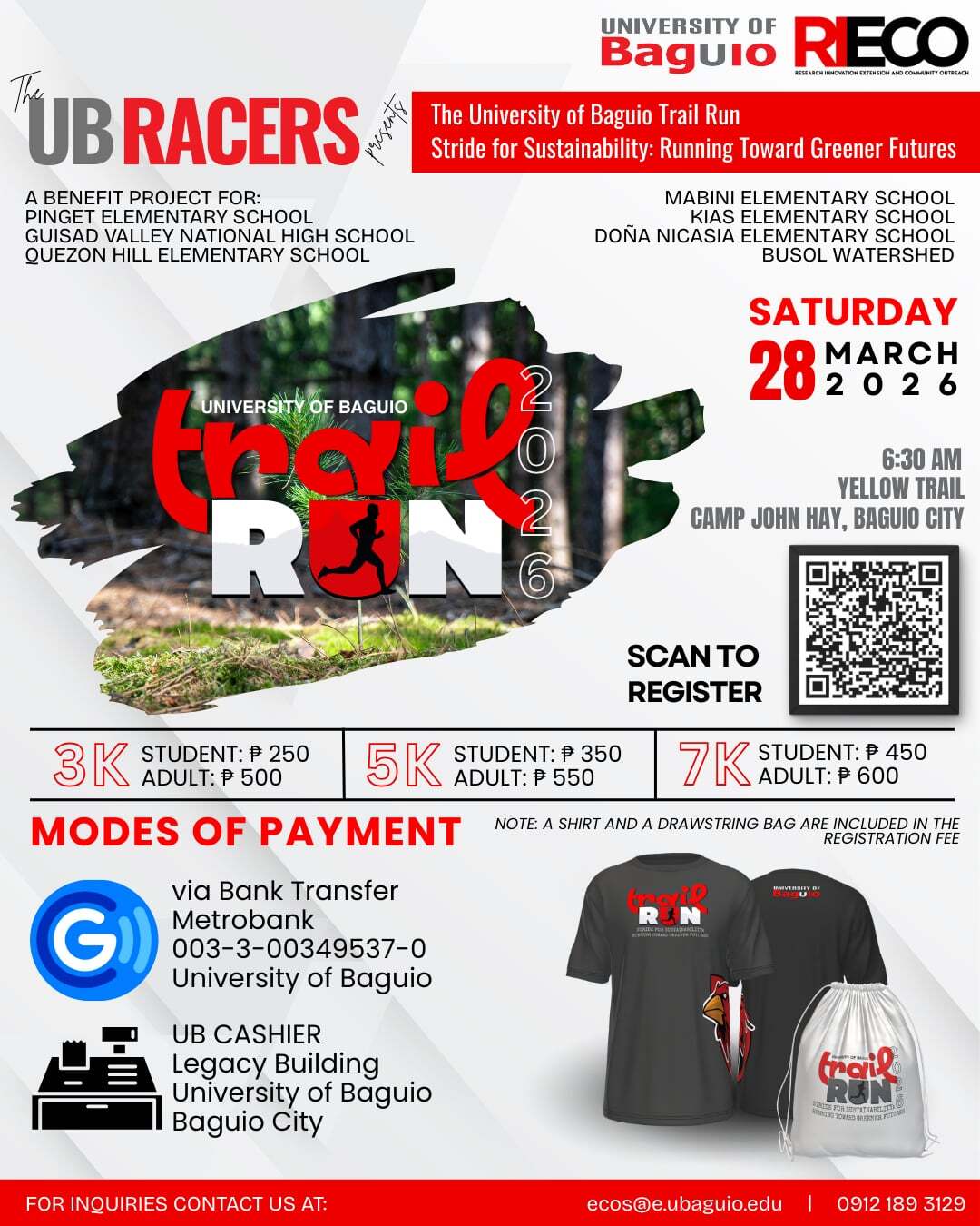 Join the UB Racers as the University of Baguio hosts the Trail Run 2026: Stride for Sustainability β Running Toward Greener Futures on March 28, 2026, 6:30 AM at the Yellow Trail, Camp John Hay, Baguio City.