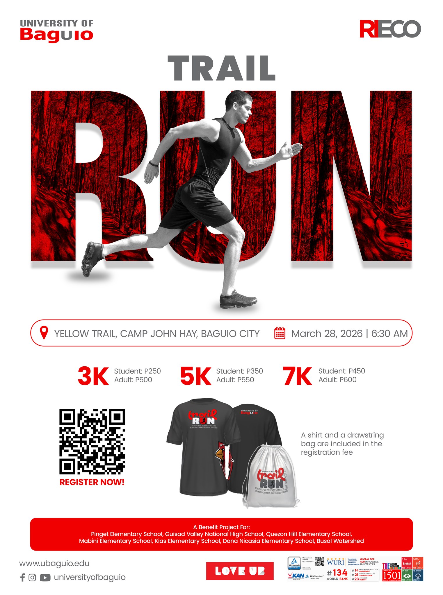 Led by the Research Innovation Extension and Community Outreach (RIECO) division of the University of Baguio, join and be a part of the 2026 trail run as we celebrate the thrill and excitement of nature in support of a bigger cause and purpose for sustainability.