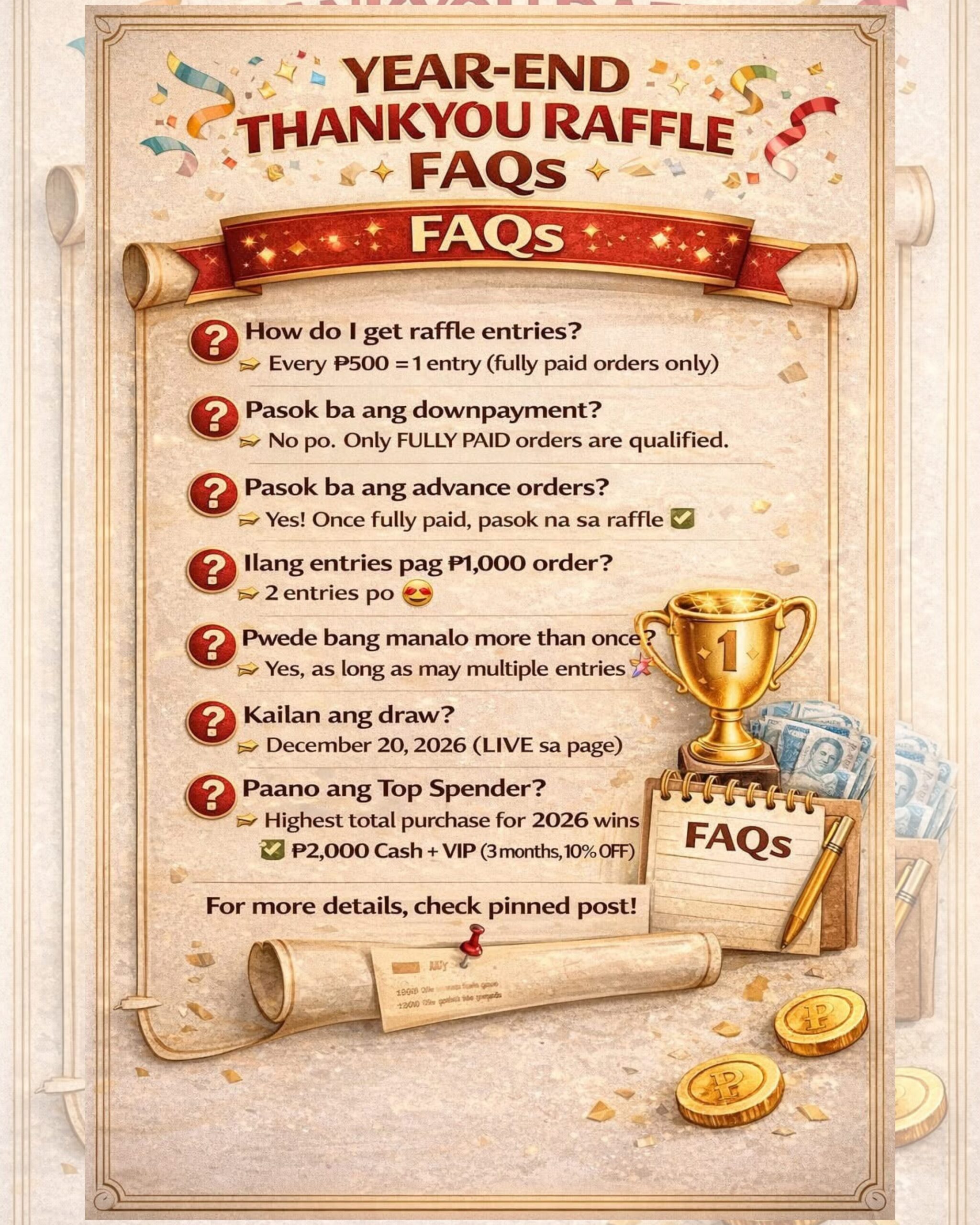 HOW TO JOIN: Every ₱500 purchase = 1 Raffle Entry Fully paid orders only Advance orders are qualified once fully paid